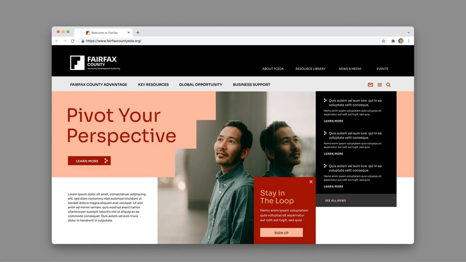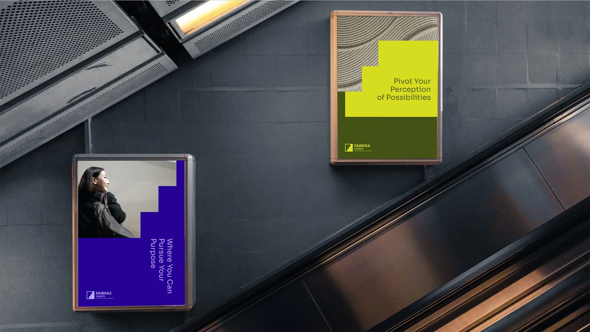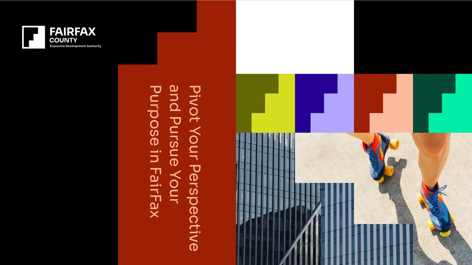 The Fairfax County Economic Development Authority brand was reimagined with a bold, modern visual identity. The “F” logo symbol serves as a conceptual and structural anchor, while the F-shape in the design system frames type and imagery, conveying elevation and forward momentum. A sophisticated color palette, modern typeface, photography that captures unique angles and sideways type treatments reinforce the “Pivot Your Perspective” concept, and the design system extends these ideas across brand assets.