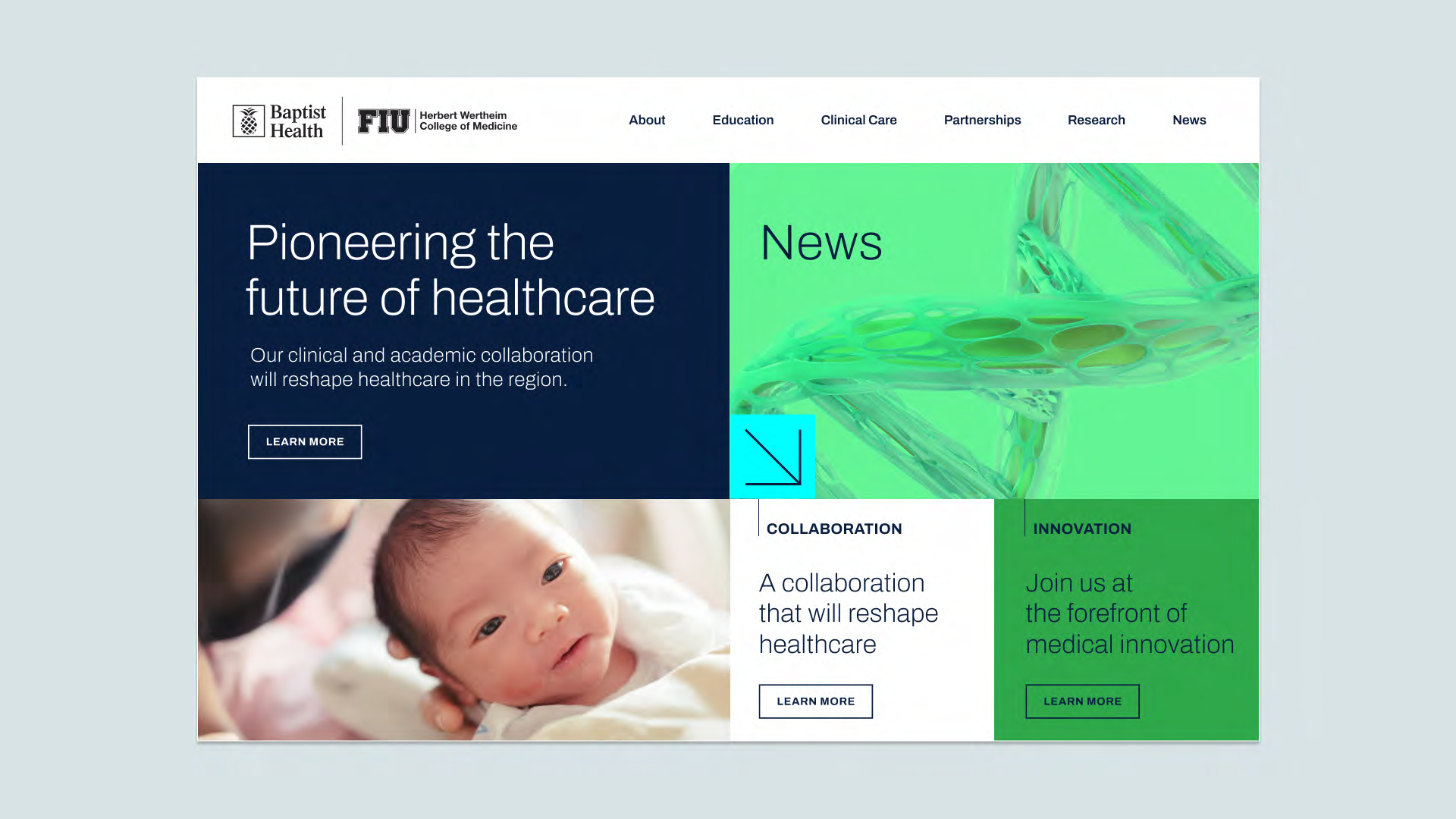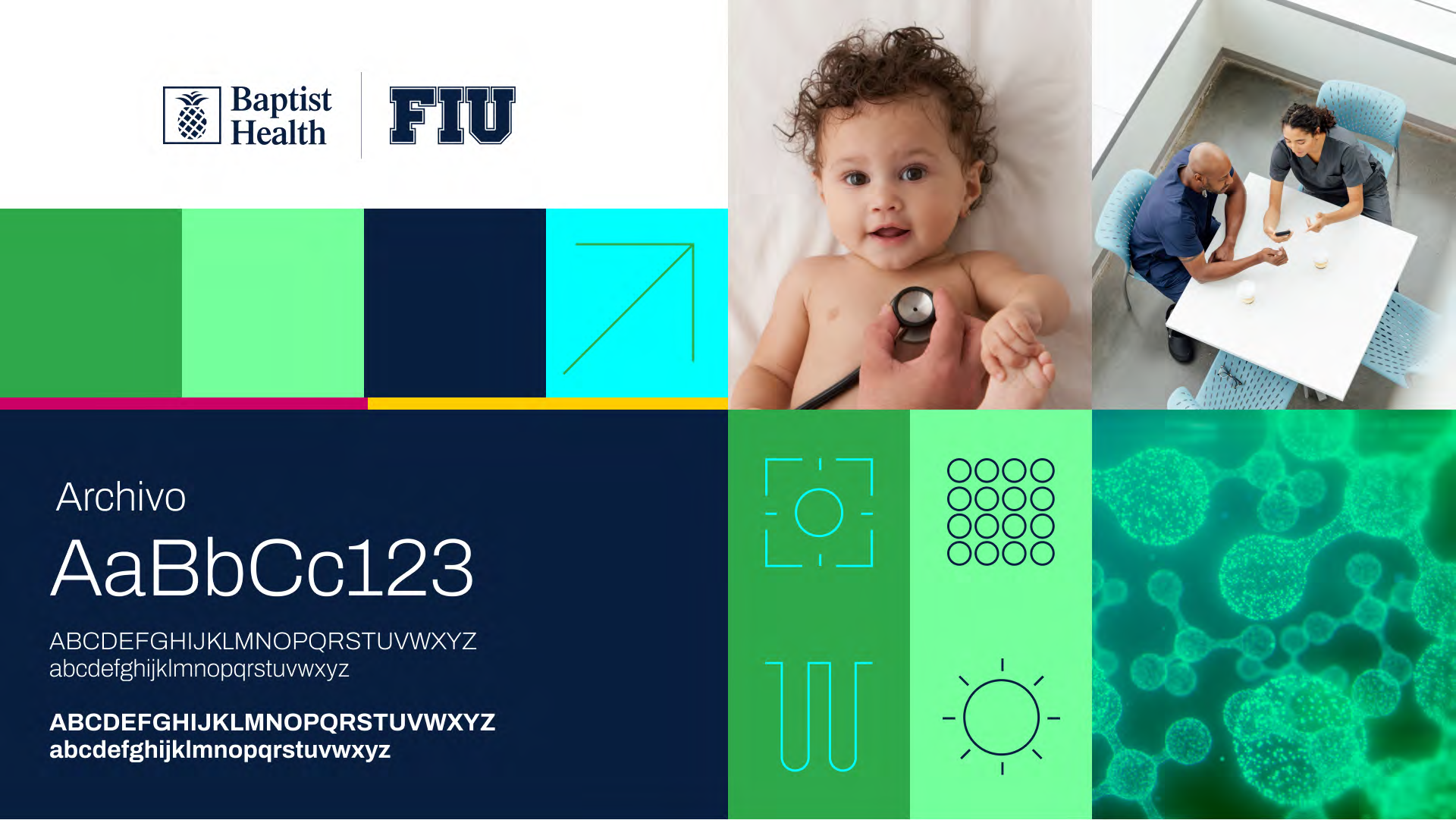 The partnership between Baptist Health and FIU aims to transform South Florida’s healthcare landscape, elevating Baptist Hospital to a statutory teaching hospital and expanding medical education, research, and patient care. The visual identity needed to communicate collaboration, innovation, and academic excellence while balancing the unique strengths of both organizations.