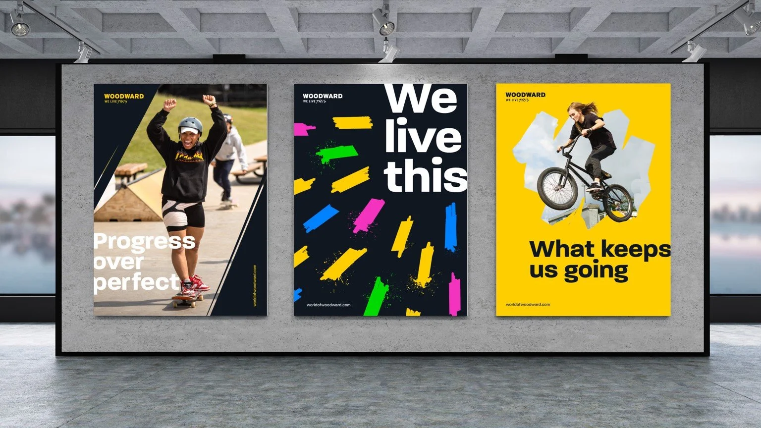 The refreshed design system for Woodward evolves the brand’s existing visual language into something more expressive and human. Loose brushstrokes in bold, signature colors convey creativity, individuality, and genuine self-expression in all its forms. The energetic visual style feels like movement itself—reflecting the rhythm, spontaneity, and joy of action sports.